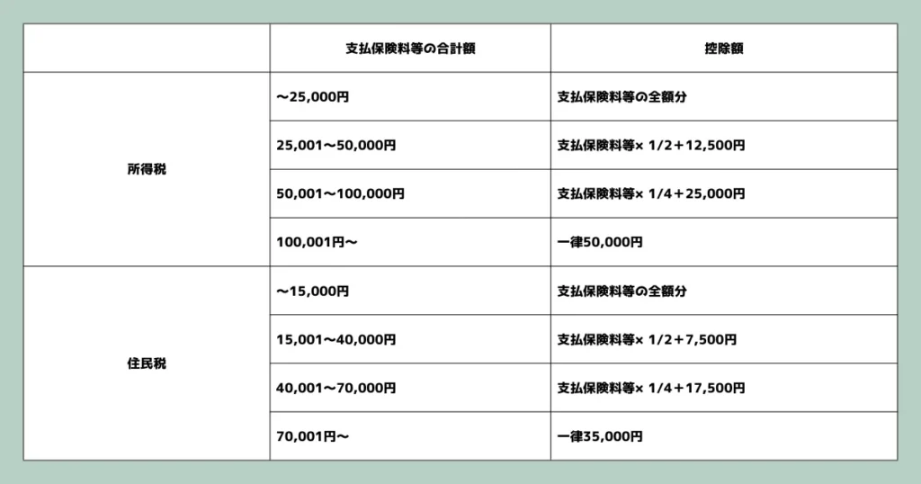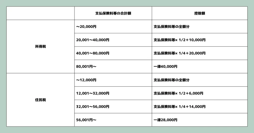 年間の支払保険料等が4万円だとすると、控除額は所得税30,000円(40,000円×1/4+20,000円)、住民税24,000円(40,000円×1/4+14,000円)となります。